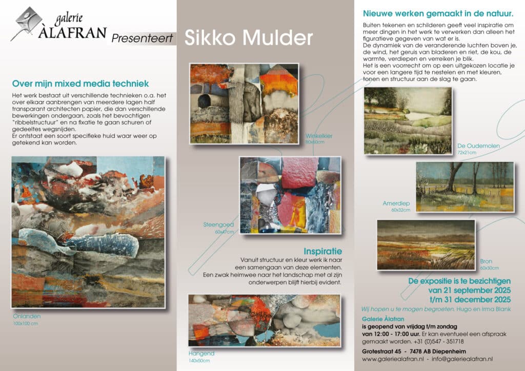 Graag nodigen wij u uit voor een zeer uitgebreide tentoonstelling met kunstwerken van Sikko Mulder. Deze is te bezichtigen van 21 september 2025 t/m 31 december 2025.